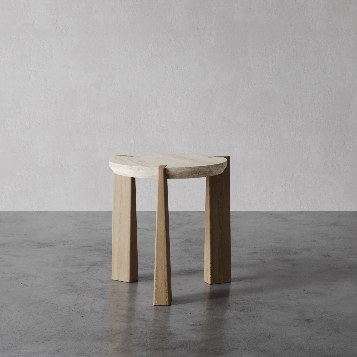 The Aline Wedge-Leg Side Table brings architectural clarity to a smaller scale. A hand-finished travertine top rests on three hand-cast legs in a cerused natural oak finish, balancing form and material warmth. Each stone surface reveals unique natural veining, adding depth and texture. Designed to complement the Aline coffee table, it anchors living rooms, bedrooms, and lounge spaces with proportion and craft.