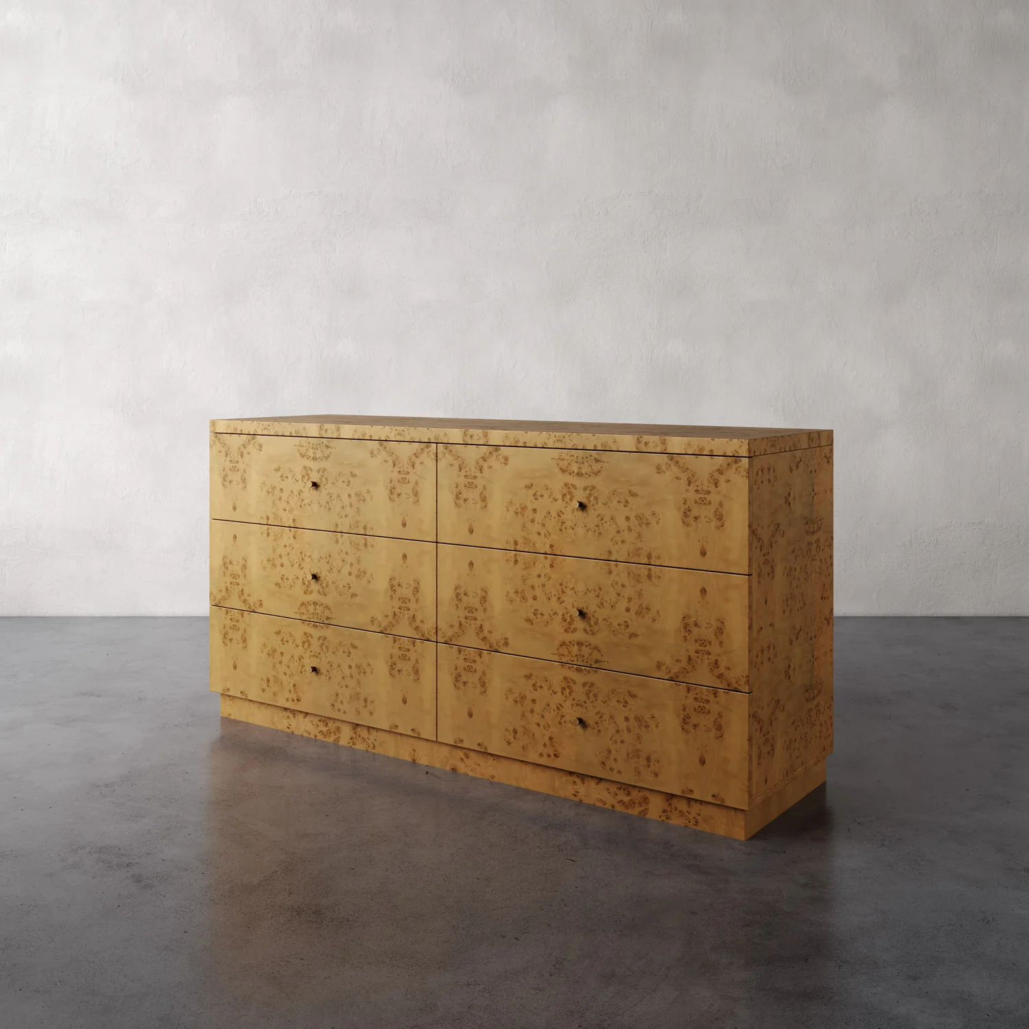 The Lemieux Et Cie Avenir Dresser in Mappa Burl seamlessly blends timeless beauty with functional design. Inspired by the refined simplicity of Milo Baughman and T.H. Robsjohn-Gibbings, this meticulously crafted piece showcases the natural beauty of Mappa burl wood, complemented by minimal hand-cast brass hardware. Perfectly proportioned, the Avenir offers six soft-close drawers, providing ample storage for clothing and essentials while ensuring quiet presence in any space. A testament to understated luxury, this dresser is a true heirloom-quality addition to your home.
