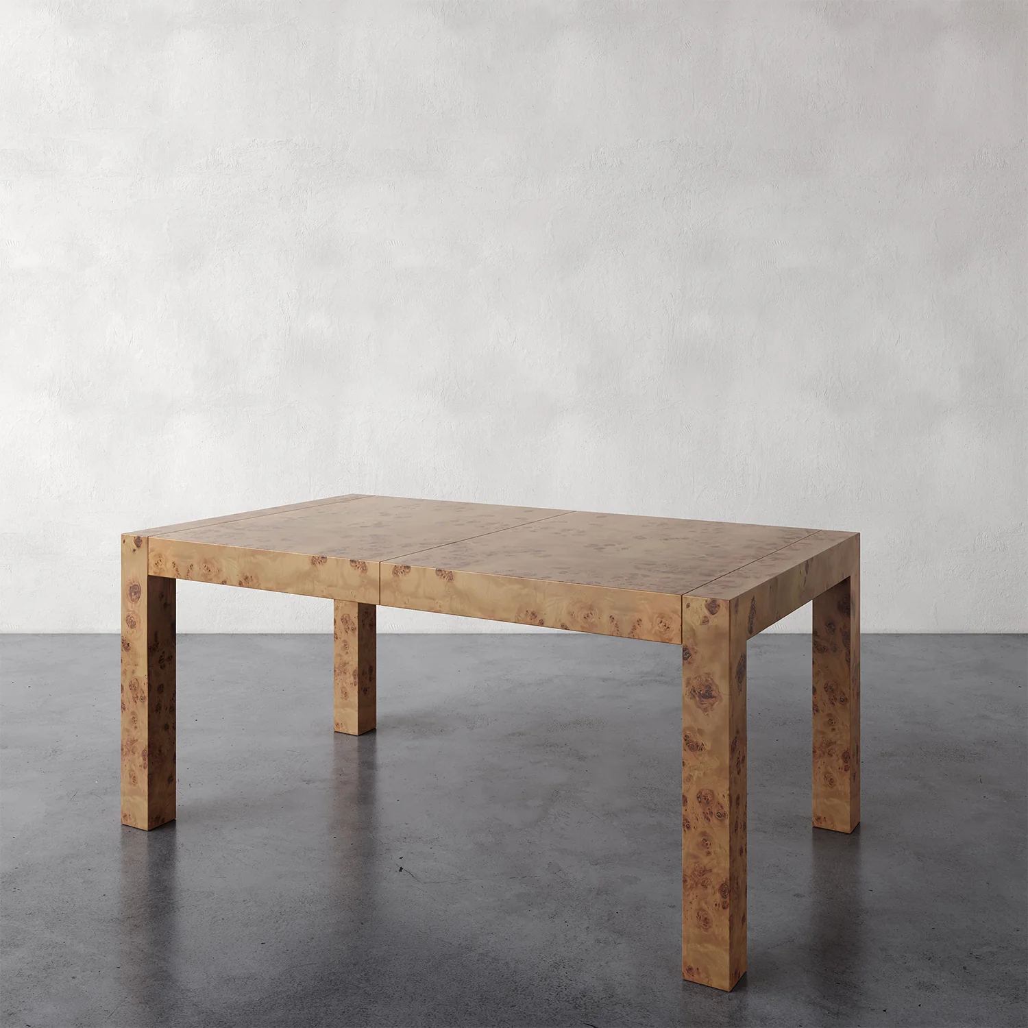 Classic Parsons proportions, as developed by designer Jean-Michel Frank, lend a beautiful balance and timeless quality to this extension dining table made of natural Mappa burl wood. Leaves extend the table’s length to suit larger rooms or special occasions.