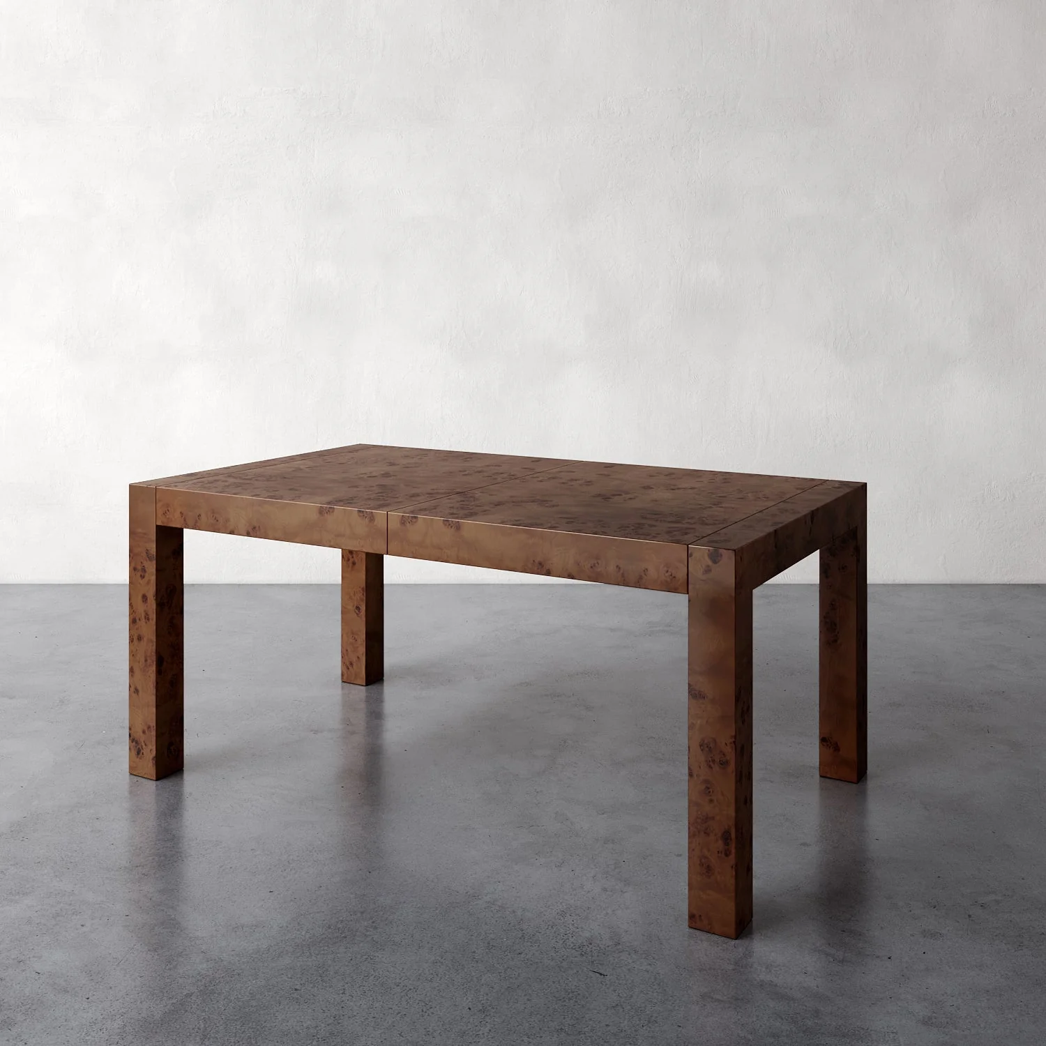 Classic Parsons proportions, as developed by designer Jean-Michel Frank, lend a beautiful balance and timeless quality to this extension dining table made of natural burl wood. Leaves extend the table’s length to suit larger rooms or special occasions. Available in 2 finishes of burl: Blonde or Walnut.