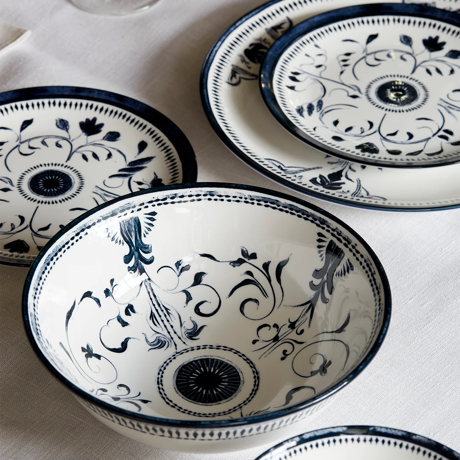 The "Bruges" dinner set draws its inspiration from the timeless beauty of Belgian design and the iconic Dutch Delftware, reinterpreted through a modern lens to enhance contemporary luxury dining. Its elegant hand painted blue and white floral motifs evoke the artisanal craftsmanship of classic European ceramics, while the refined detailing ensures a formal yet versatile aesthetic perfect for any occasion. Whether used for an intimate dinner or grand entertaining, the set marries traditional European artistry with modern decoration, offering both functionality and beauty. The minimal shapes and delicate patterns give each piece an heirloom quality, ideal for elevating any dining experience.