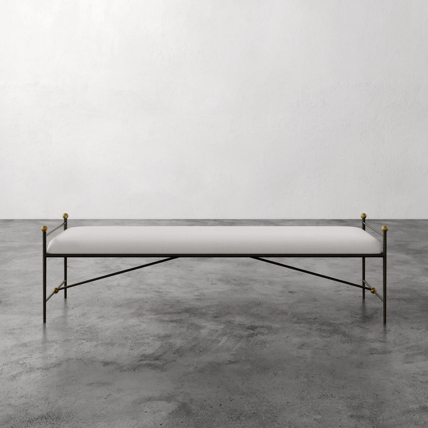 The Cambert Bench translates the collection’s sculptural metal vocabulary into a functional seating piece. A hammered bronze-finished iron frame with aged brass ball accents supports a cushioned seat upholstered in white woven performance-grade fabric, while the structural X-base adds stability and visual rhythm. Inspired by the refined ironwork of postwar Paris, Cambert balances decorative detail with everyday utility for entryways, bedrooms, or the foot of a bed.