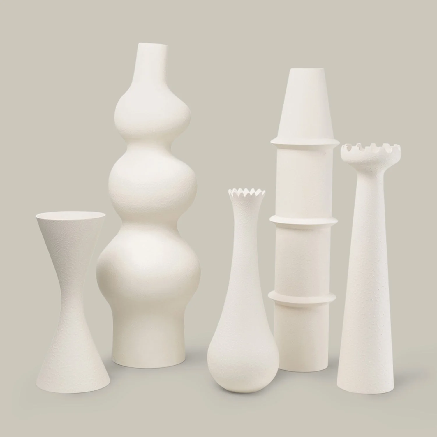 The Overscale Vases in Matte White combine scale and organic form for decorative drama. Whether alone or in a grouping, these vases are the perfect graphic elements to complement any decor. Listed from left to right as shown in the image: Deoune Vase, Pasteur Vase, Fenouil Vase, Panisse Vase, and Muguet Vase.