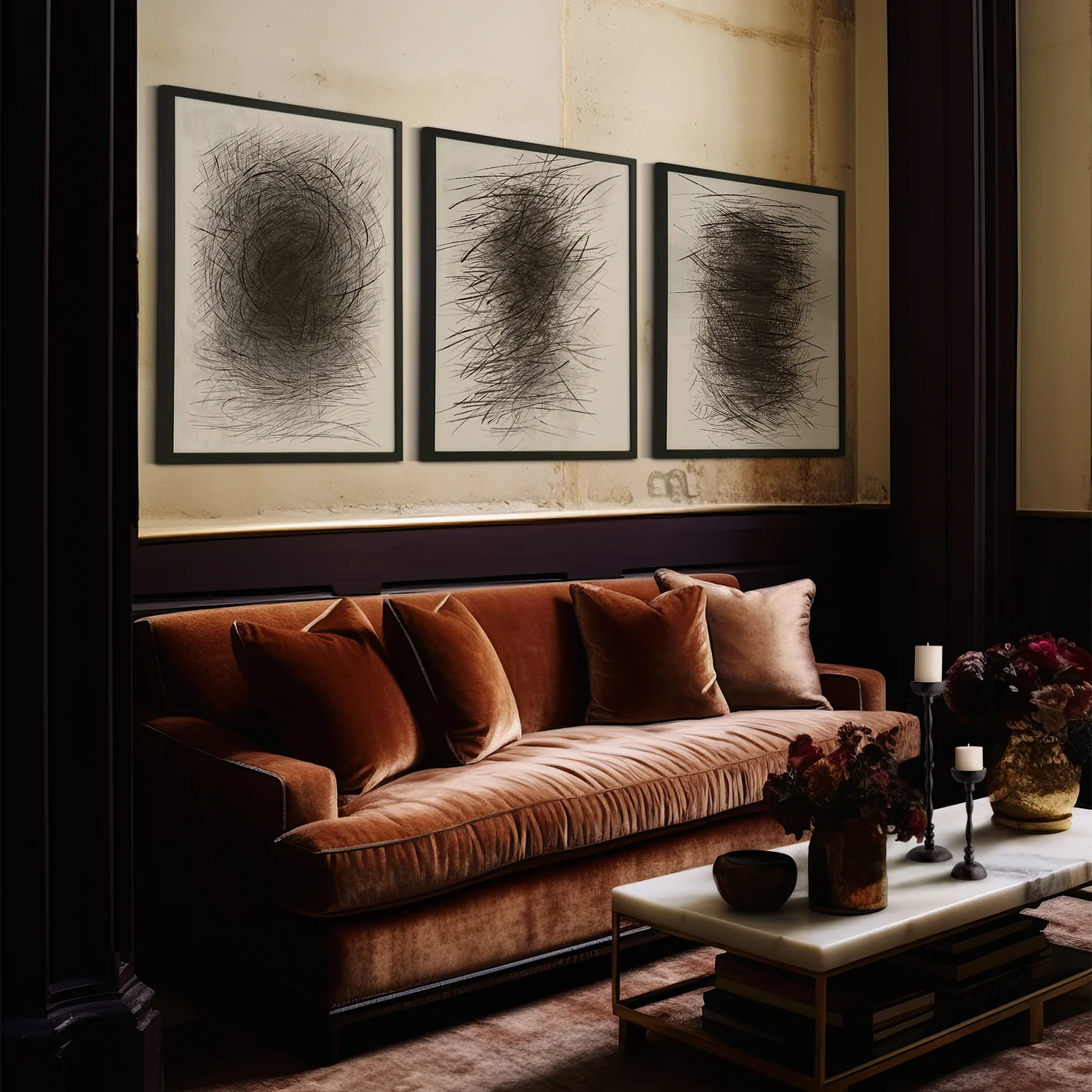 Crafted with a meticulous blend of charcoal, oil stick, and graphite, these black and white abstract pieces evoke a sense of enigmatic beauty. Each stroke weaves a tale of tangled depths and hidden secrets, akin to wandering through a dense thicket where shadows intertwine with light. The dynamic interplay of monochromatic tones and textures creates an ethereal visual journey.