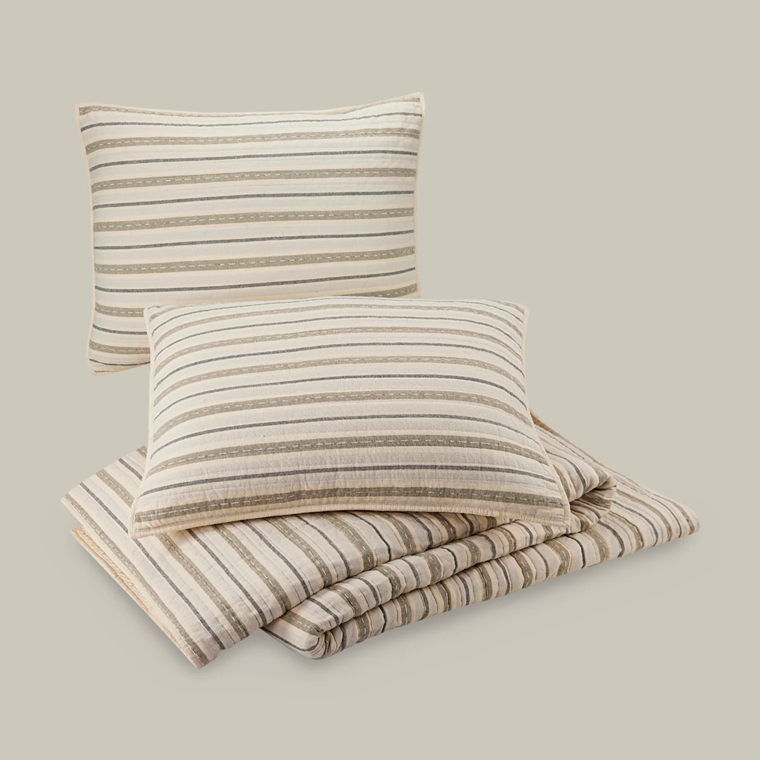 The Lucien Quilt touches on the legacy of 18th-century French woven stripes to create beautiful cotton flanneled set with an exquisitely soft hand feel. A 1-inch horizontal channel stitch adds a gorgeous textural pattern to the yarn dye face, while cotton fill and percale backing complete the luxe cozy set. Quilt and shams sold separately; shams are packed individually.