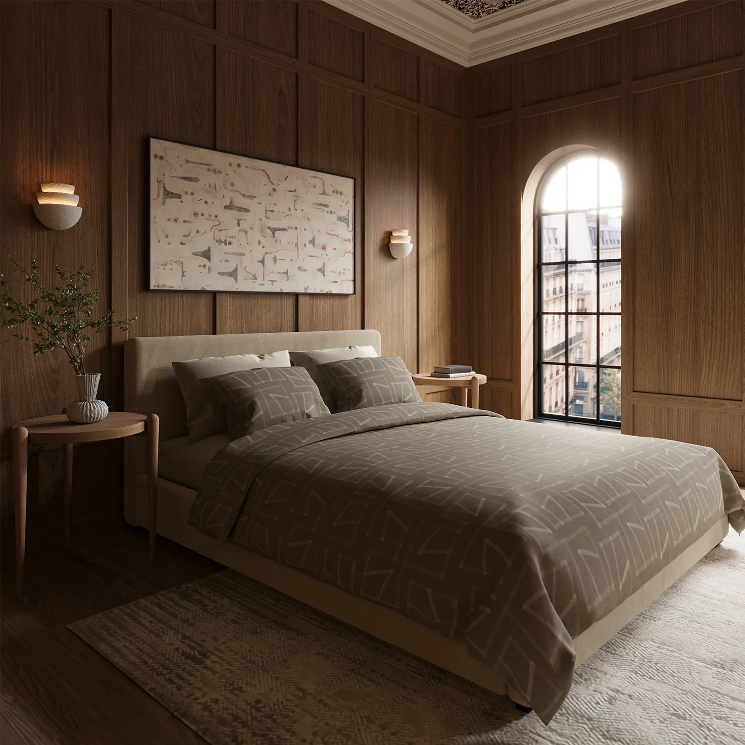 Elevate your bedroom decor with this gorgeous Mareé duvet set embellished with intricate geometric embroidery. The duvet cover serves as a canvas of shapes, meticulously stitched in a modern pattern that adds a touch of sophistication to any space. The precision of the embroidery work is a celebration of the craftsmanship in the design. Made from sumptuously soft bamboo-linen blend fabric, this duvet set not only adds a luxurious aesthetic to your bedroom but also ensures a cozy and restful night's sleep.