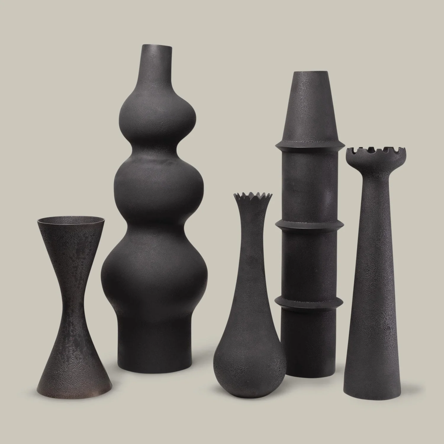The Overscale Vases in Black combine scale and organic form for decorative drama. The Panisse vase with its tall cylindrical form, adds drama to any space. Whether alone or in a grouping, these vases are the perfect graphic elements to complement any decor. Listed from left to right as shown in the last image: Deoune Vase, Pasteur Vase, Fenouil Vase, Panisse Vase, and Muguet Vase.